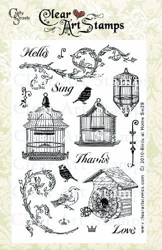 SM29 "Birdies" is a 4 by 6-Inch medium size Clear Art Stamp set with 18 separate stamps. This includes two swirly branch designs with tiny text, three different bird cages (1-Inch to 2-Inch h), three birds (one to color and 2 silhouette love birds), 'His and Hers' mini crowns for the birds, an altered bird house, three decorative hangers, plus words; Hello, Sing, Thanks and Love. With so many different pieces you can mix and match designs to embellish a variety of greeting cards, gift tags, ATC's, scrapbook layouts and keepsakes. Clear Art Stamps inspire creativity with detailed vintage designs and images crafted in the USA from high quality photopolymer.